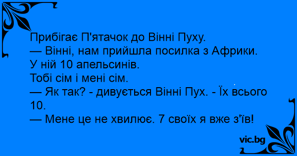 — Вінні, нам прийшла посилка з Африки. У ній 10 апельсинів.