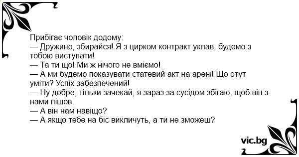 — Дружино, збирайся! Я з цирком контракт уклав, будемо з тобою виступати!
