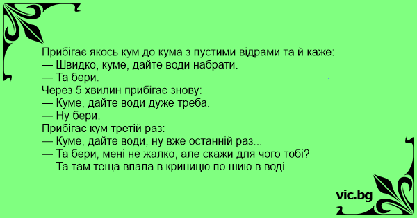 — Та там теща впала в криницю по шию в воді...