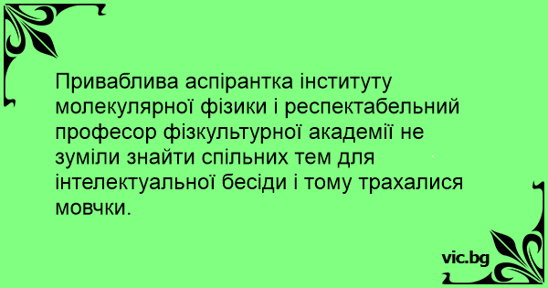 Приваблива аспірантка інституту молекулярної фізики і респектабельний професор фізкультурної академії не зуміли знайти спільних тем для інтелектуальної бесіди і тому трахалися мовчки.