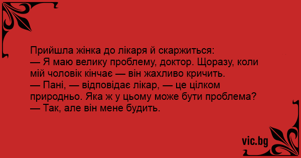 — Я маю велику проблему, доктор. Щоразу, коли мій чоловік кінчає — він жахливо кричить.