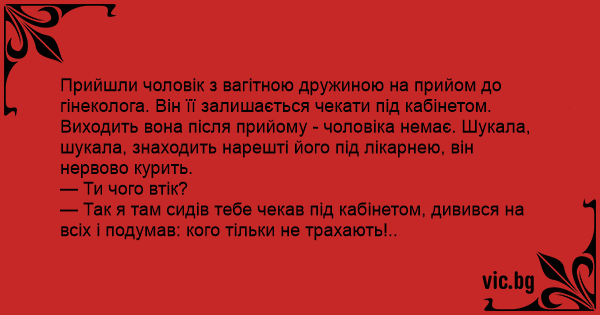 Прийшли чоловік з вагітною дружиною на прийом до гінеколога. Він її залишається чекати під кабінетом. Виходить вона після прийому - чоловіка немає. Шукала, шукала, знаходить нарешті його під лікарнею, він нервово курить.