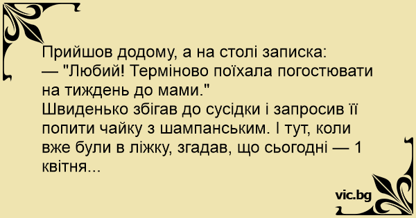 Швиденько збігав до сусідки і запросив її попити чайку з шампанським. І тут, коли вже були в ліжку, згадав, що сьогодні — 1 квітня...