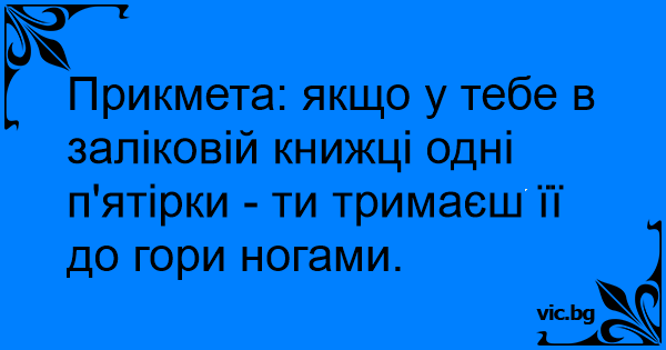 Прикмета: якщо у тебе в заліковій книжці одні п'ятірки - ти тримаєш її до гори ногами.