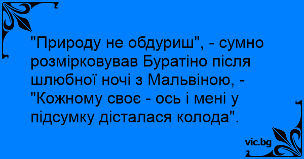 "Природу не обдуриш", - сумно розмірковував Буратіно після шлюбної ночі з Мальвіною, - "Кожному своє - ось і мені у підсумку дісталася колода".