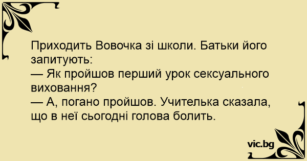 Иванчо се прибира от училище. Родителите му питат: - Как мина днес първият ви урок по с*ексуално възпитание? - А, много лошо. Учителката каза, че днес я боли главата.