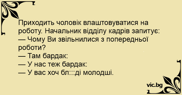 Приходить чоловік влаштовуватися на роботу. Начальник відділу кадрів запитує: