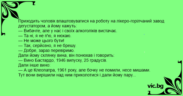 Приходить чоловік влаштовуватися на роботу на лікеро-горілчаний завод дегустатором, а йому кажуть:
