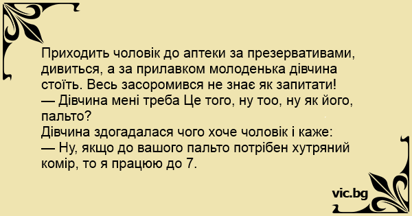 Приходить чоловік до аптеки за презервативами, дивиться, а за прилавком молоденька дівчина стоїть. Весь засоромився не знає як запитати!