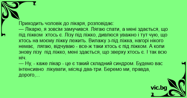 — Лікарю, я зовсім замучився. Лягаю спати, а мені здається, що під ліжком хтось є. Лізу під ліжко, дивлюся уважно і тут чую, що хтось на моєму ліжку лежить. Вилажу з-під ліжка, нагорі нікого немає, лягаю, відчуваю - все-ж таки хтось є під ліжком. А коли знову лізу під ліжко, мені здається, що зверху хтось є. І так всю ніч.