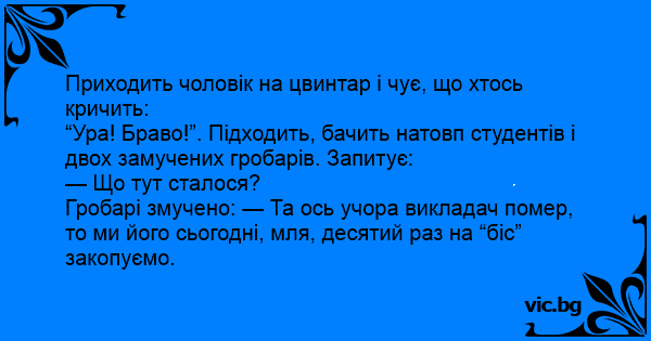 Гробарі змучено: — Та ось учора викладач помер, то ми його сьогодні, мля, десятий раз на “біс” закопуємо.