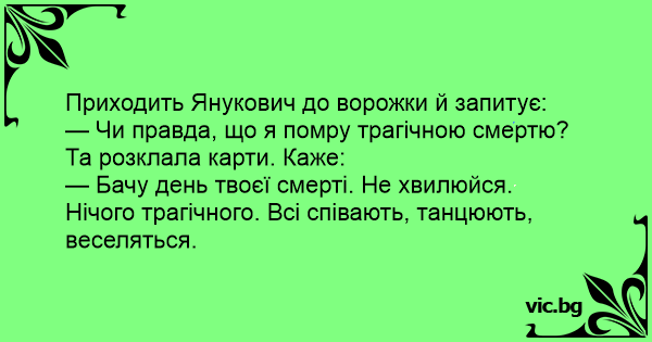 — Бачу день твоєї смерті. Не хвилюйся. Нічого трагічного. Всі співають, танцюють, веселяться.