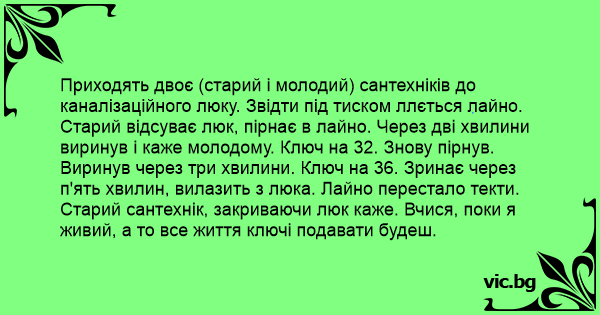 Приходять двоє (старий і молодий) сантехніків до каналізаційного люку. Звідти під тиском ллється лaйнo. Старий відсуває люк, пірнає в лaйнo. Через дві хвилини виринув і каже молодому. Ключ на 32. Знову пірнув. Виринув через три хвилини. Ключ на 36. Зринає через п'ять хвилин, вилазить з люка. Лaйнo перестало текти. Старий сантехнік, закриваючи люк каже. Вчися, поки я живий, а то все життя ключі подавати будеш.