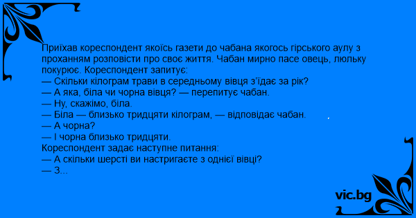Приїхав кореспондент якоїсь газети до чабана якогось гірського аулу з проханням розповісти про своє життя. Чабан мирно пасе овець, люльку покурює. Кореспондент запитує: