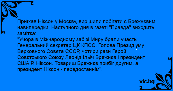 Приїхав Ніксон у Москву, вирішили побігати с Брежнєвим навипередки. Наступного дня в газеті "Правда" виходить замітка: