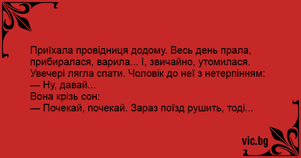 Приїхала провідниця додому. Весь день прала, прибиралася, варила... І, звичайно, утомилася. Увечері лягла спати. Чоловік до неї з нетерпінням: