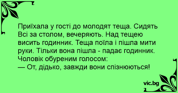 Приїхала у гості до молодят теща. Сидять Всі за столом, вечеряють. Hад тещею висить годинник. Теща поїла і пішла мити руки. Тільки вона пішла - падає годинник. Чоловік обуреним голосом: