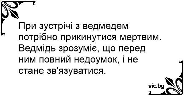 При зустрічі з ведмедем потрібно прикинутися мертвим. Ведмідь зрозуміє, що перед ним повний недоумок, і не стане зв'язуватися.