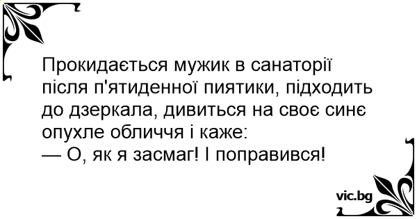 Прокидається мужик в санаторії після п'ятиденної пиятики, підходить до дзеркала, дивиться на своє синє опухле обличчя і каже: