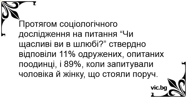 Протягом соціологічного дослідження на питання “Чи щасливі ви в шлюбі?” ствердно відповіли 11% одружених, опитаних поодинці, і 89%, коли запитували чоловіка й жінку, що стояли поруч.