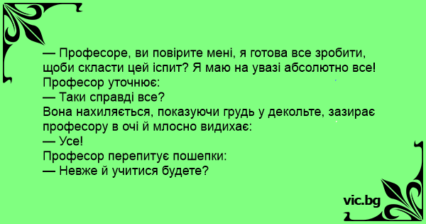 Сé Alles für das Examen Студентка влиза в кабинета на млад преподавател, разкопчава няколко копчета на ризата си и коленичи: A student comes to a young professor's office hours. Um professor está trabalhando em seu escritório durante o horário de funcionamento. Een super mooie 20 jarige studente loopt het kantoortje in van een jonge en knappe professor. Ze gluurt even de gang in, doet de deur op slot en gaat smekend op haar knieën. Met een zachte en... En ung, söt universitetsstudent gick ner till sin lärares rum efter en lektion. Hon tittade runt i korridoren, smet snabbt in, stängde dörren och ställde sig på knä framför honom. - Jag gör vad... A garota muito bonita, vestindo uma saia minúscula e um mini blusa decotadíssima, chega para o professor de matemática reclamando que precisa tirar a nota máxima no exame para poder passar. —... Ik heb er alles voor over om een goed cijfer voor dit tentamen te halen,” verklaarde een studente tegen haar professor. Ze boog zich naar hem over en staarde hem aan. “Ik wil er werkelijk alles... Studio del professore universitario. E' orario di ricevimento degli studenti. Bussano alla porta ed entra una stupenda bionda, alta, con tacchia alti, minigonna vertiginosa e maglietta aderente.... Η όμορφη φοιτήτρια μπαίνει στο γραφείο του καθηγητή. Βεβαιώνεται πρώτα ότι Δεν είναι κανείς στο διάδρομο και κλείνει πίσω της την πόρτα. Πλησιάζει Τον καθηγητή και, χωρίς πολλές περιστροφές, του... Atraktivní studentka přijde před zkouškou k profesorovi. Posadí se, poodhrne sukni a řekne: „Udělala bych cokoliv, abych zítra tu zkoušku udělala.” Profesor vytáhne obočí: „Cokoliv?” Studentka si... Zgodna studentkinja nikako da položi ispit pa je profesor malo kritikuje. Ona, svesna svoje lepote i šarma, reče: • Profesore, sve ću učiniti da položim ispit! • Baš sve? • Baš sve! • Jesi li... Згодна студентка никако да положи испит, па професорот ја прекорува. Меѓутоа свесна на својата убавина и шарм таа му вика: - Професоре, се ќе сторам само да го положам испитов. - Баш се? - Да. -...