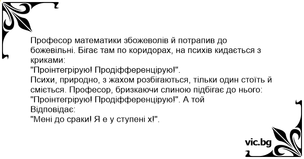Професор математики збожеволів й потрапив до божевільні. Бігає там по коридорах, на психів кидається з криками: