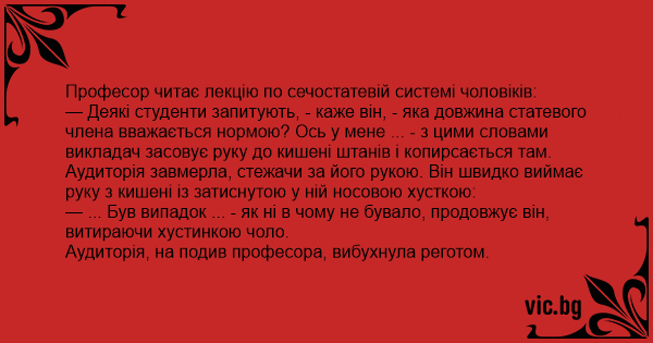 — Деякі студенти запитують, - каже він, - яка довжина статевого члeнa вважається нормою? Ось у мене ... - з цими словами викладач засовує руку до кишені штанів і копирсається там. Аудиторія завмерла, стежачи за його рукою. Він швидко виймає руку з кишені із затиснутою у ній носовою хусткою: