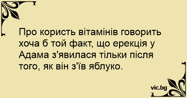 Про користь вітамінів говорить хоча б той факт, що ерекція у Адама з'явилася тільки після того, як він з'їв яблуко.