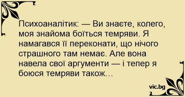 Психоаналітик: — Ви знаєте, колего, моя знайома боїться темряви. Я намагався її переконати, що нічого страшного там немає. Але вона навела свої аргументи — і тепер я боюся темряви також…