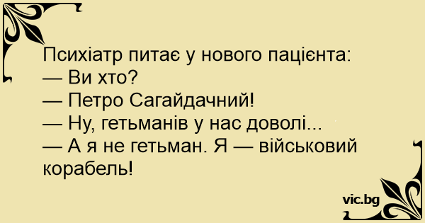 Психіатр питає у нового пацієнта:<br />— Ви хто?<br />— Петро Сагайдачний!<br />— Ну, гетьманів у нас доволі...<br />— А я не гетьман. Я — військовий корабель!