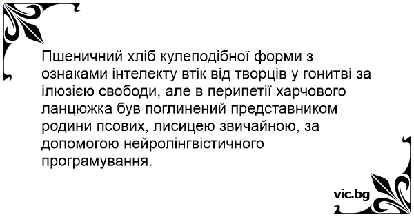 Пшеничний хліб кулеподібної форми з ознаками інтелекту втік від творців у гонитві за ілюзією свободи, але в перипетії харчового ланцюжка був поглинений представником родини псових, лисицею звичайною, за допомогою нейролінгвістичного програмування.