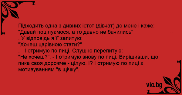 "Hе хочеш?", - І отримую знову по пиці. Вирішивши, що пика своя дорожче - цілую. І? І отримую по пиці з мотивуванням "в щічку".