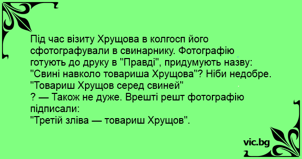 Під час візиту Хрущова в колгосп його сфотографували в свинарнику. Фотографію готують до друку в "Правді", придумують назву: