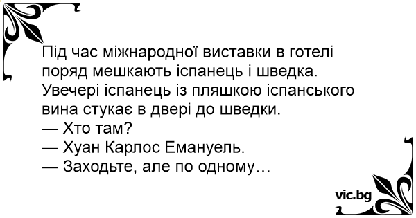 Під час міжнародної виставки в готелі поряд мешкають іспанець і шведка. Увечері іспанець із пляшкою іспанського вина стукає в двері до шведки.