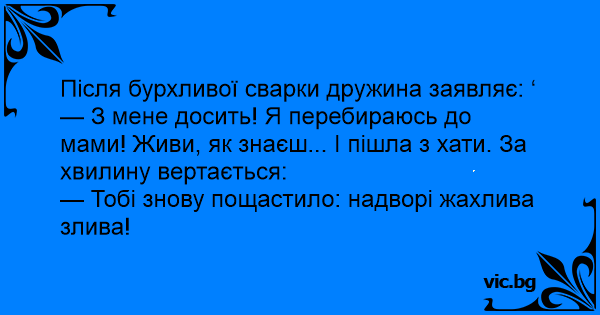 — З мене досить! Я перебираюсь до мами! Живи, як знаєш... І пішла з хати. За хвилину вертається: