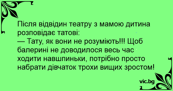 — Тату, як вони не розуміють!!! Щоб балерині не доводилося весь час ходити навшпиньки, потрібно просто набрати дівчаток трохи вищих зростом!