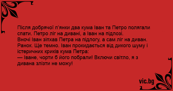 Після добрячої п’янки два кума Іван та Петро полягали спати. Петро ліг на дивані, а Іван на підлозі.