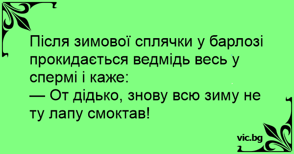 Після зимової сплячки у барлозі прокидається ведмідь весь у спермі і каже: