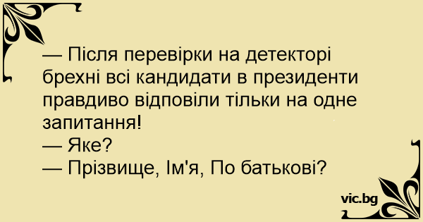 — Після перевірки на детекторі брехні всі кандидати в президенти правдиво відповіли тільки на одне запитання!