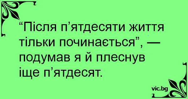 Если после пятидесяти ваша жизнь Вас не устраивает - налейте еще пятьдесят. Ако след петдесет живота не ви харесва, налейте си още петдесет ... Животът след петдесетте точно започва - помисли си една жена и помоли да й сипят още петдесет. Жизнь после пятидесяти только начинается - подумала женщина и попросила налить еще пятьдесят Життя після п'ятдесяти тільки починається... — подумала жінка і попросила налити ще п'ятдесят.. “Після п’ятдесяти життя тільки починається”, — подумав я й плеснув іще п’ятдесят. 0 0 0