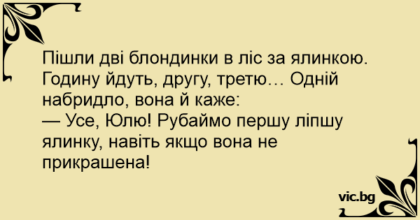 Dvě blondýny se rozhodnou, že vyrazí do lesa pro vánoční stromeček. Bloudí po lese, hodinu, dvě, tři... Pak se ozve: „Ivano, máš něco?” „Ne, vůbec nic. A ty?” „Já taky ne. Tak co kdybychom vzaly...