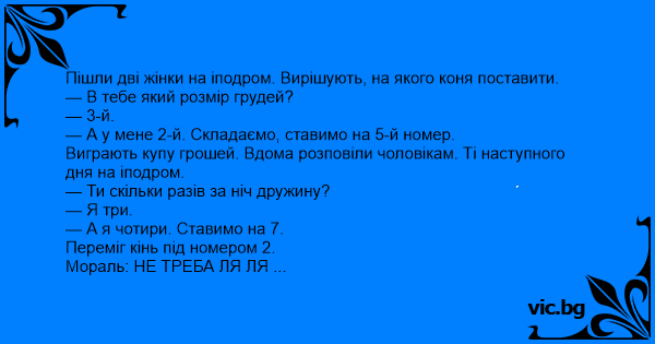 Пішли дві жінки на іподром. Вирішують, на якого коня поставити.