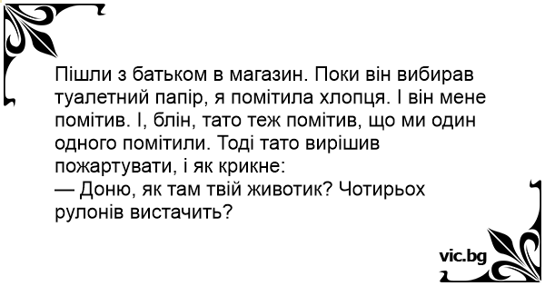 Пішли з батьком в магазин. Поки він вибирав туалетний папір, я помітила хлопця. І він мене помітив. І, блін, тато теж помітив, що ми один одного помітили. Тоді тато вирішив пожартувати, і як крикне: