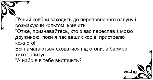 "Отже, признавайтесь, хто з вас переспав з моєю дружиною, поки я пас ваших корів, пристрелю кожного!"