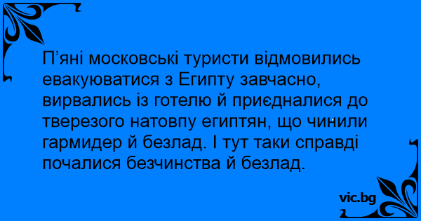 П’яні московські туристи відмовились евакуюватися з Египту завчасно, вирвались із готелю й приєдналися до тверезого натовпу египтян, що чинили гармидер й безлад. І тут таки справді почалися безчинства й безлад.