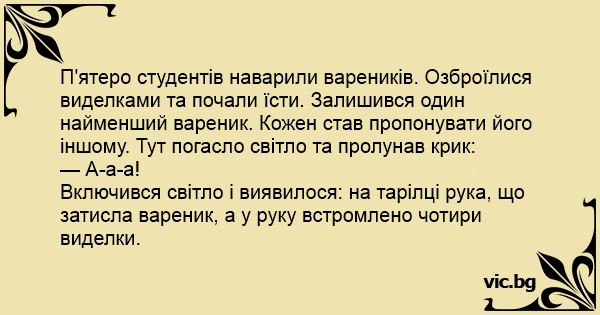 П'ятеро студентів наварили вареників. Озброїлися виделками та почали їсти. Залишився один найменший вареник. Кожен став пропонувати його іншому. Тут погасло світло та пролунав крик:
