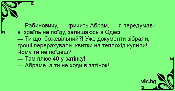 — Рабиновичу, — кричить Абрам, — я передумав і в Ізраїль не поїду, залишаюсь в Одесі.