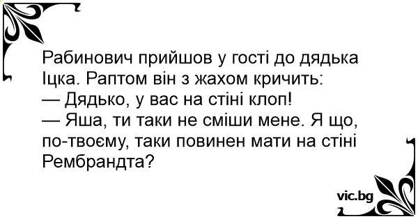 — Яша, ти таки не сміши мене. Я що, по-твоєму, таки повинен мати на стіні Рембрандта?