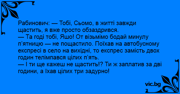 — Та годі тобі, Яшо! От візьмімо бодай минулу п’ятницю — не пощастило. Поїхав на автобусному експресі в село на вихідні, то експрес замість двох годин телімпався цілих п’ять.