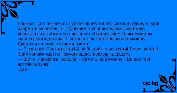 — Э, матінка! Так ви вагітні! А ну-бо дайте послухати! Точно, вагітні!